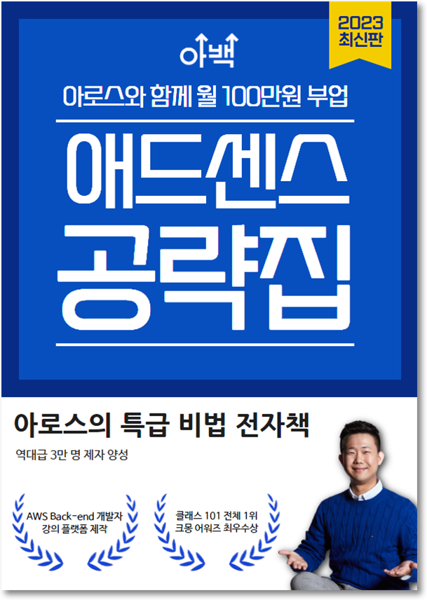 '고객센터(클릭)'로 연락주세요 > 애드센스 공략집 혜택 3가지1. 5만원에 판매중인 애드센스 승인강의 5일 무료 수강권>(아백에서 공략집 신청자만 수강 가능합니다)2. 애드센스 블로그 설정 방법3. 남들보다 10배 쉽게 블로그로 돈 버는 법 출처 : 아백 홈페이지 아로스 애드센스 TOP1애드센스 블로그로 월 100만원 만들기aros100.com